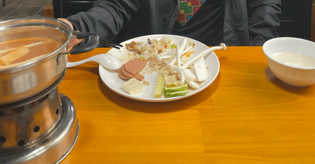 If you’re unfamiliar with this, it is a dish of soup, stock or oil that is kept simmering by a fire on the table and you can choose an array of raw meat or vegetables that you can cook by dipping in the broth.
